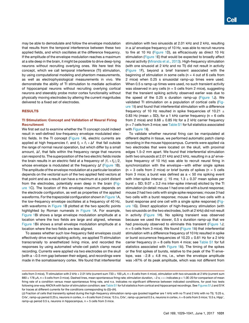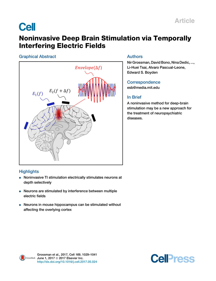 按:2017年6月1日,美国麻省理工麦戈文脑研究所、哈佛医学院、伦敦皇家医院等多家权威学术机构的10余位科学家联合在国际著名学术期刊Cell上发表了长文:Noninvasive Deep Brain Stimulation via Temporally Interfering Electric Fields,论文探讨的是一种非侵入性脑深部电刺激方法,即通过高频差频在脑深部实现低频电刺激,取代已有的用来治疗帕金森病的脑深部电刺激技术(DBS)。